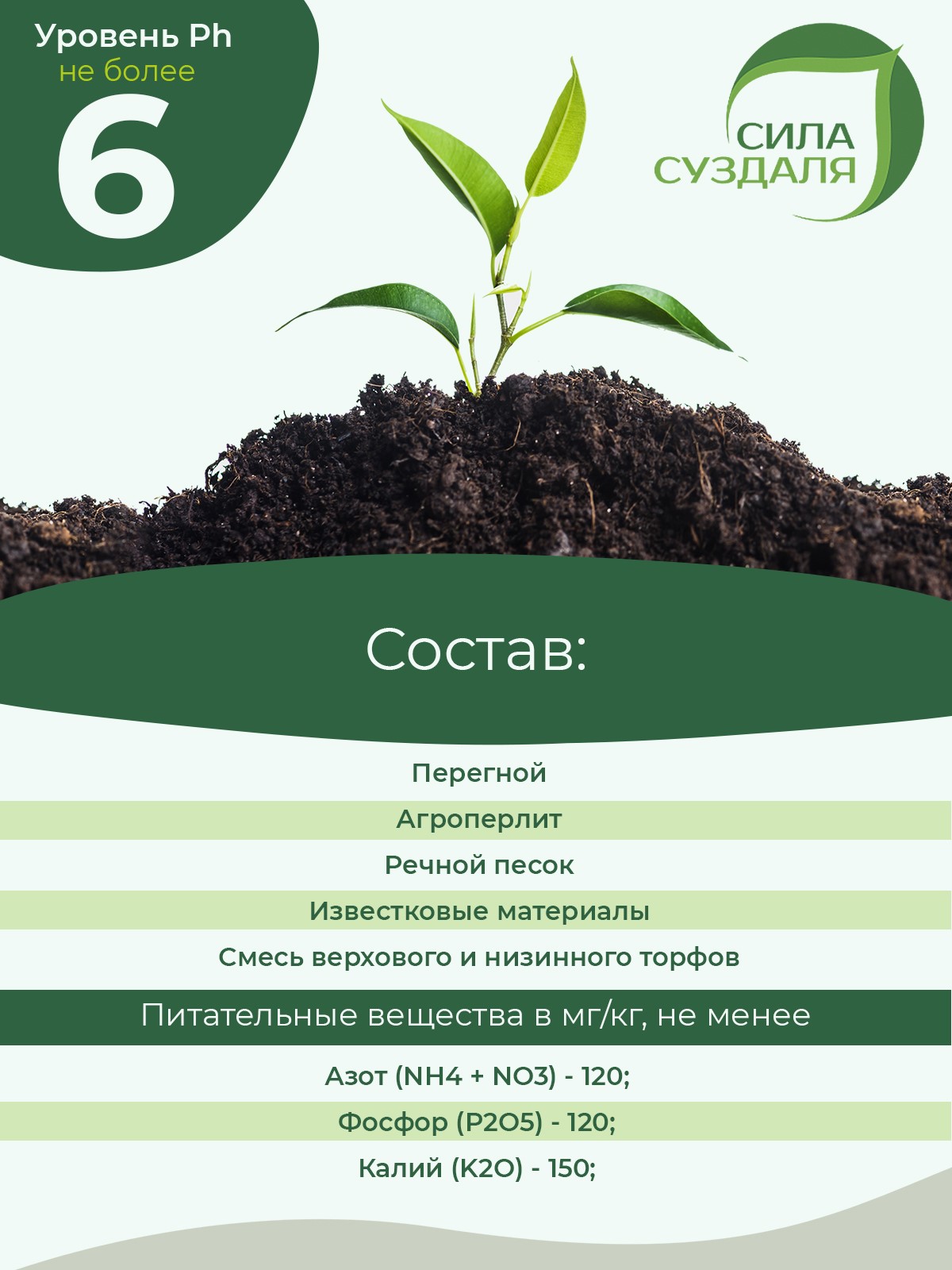 Состав: перегной, агроперлит, речной песок, известковые материалы, верховой торф, низинный торф
